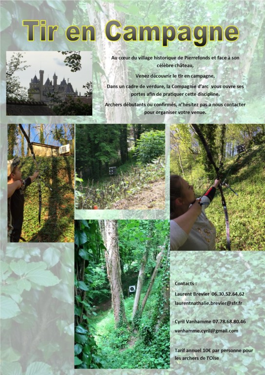 Autour du jeu d'arc, à proximité du chateau qui a fait la réputation de cette commune, se trouve un parcours de Tir en Campagne que les archers de Pierrefonds mettent a votre disposition contre une cotisaton de 10€ pour la saison. Ce parcours étant aidé par le comité départemental ce tarif concerne en priorité les archers de l'Oise. Cependant les tireurs extérieurs peuvent se renseigner sur la disponibilité.